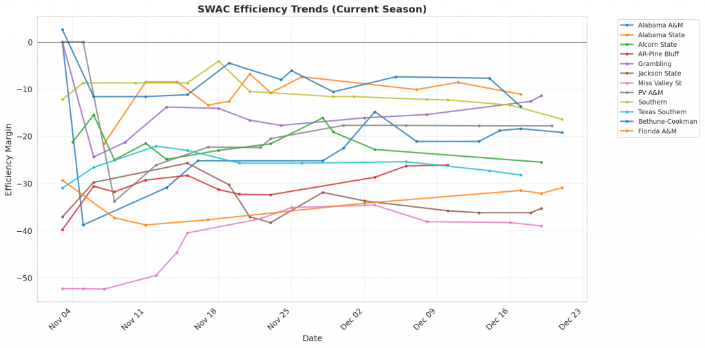 Figure 1: Efficiency margin trends for SWAC teams throughout the season. Teams trending upward show improving performance, while downward trends indicate struggles.