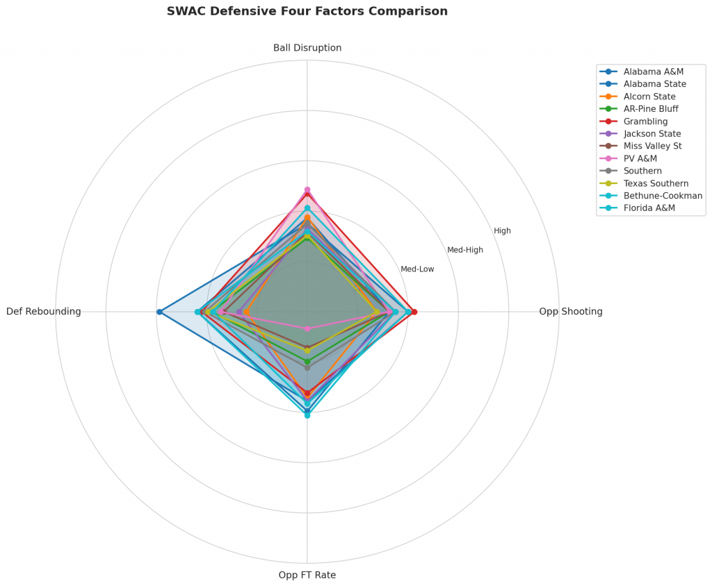 Figure 3: Defensive Four Factors comparison across SWAC teams. The radar chart shows each team’s opponent shooting defense (Opp eFG%), ball disruption (forcing TOV%), defensive rebounding (DREB%), and opponent free throw prevention (Opp FT Rate).