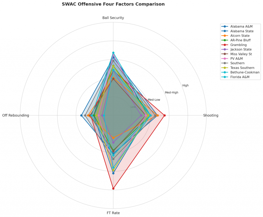 Figure 2: Offensive Four Factors comparison across SWAC teams. The radar chart shows each team’s shooting efficiency (eFG%), ball security (TOV%), offensive rebounding (OREB%), and free throw generation (FT Rate).