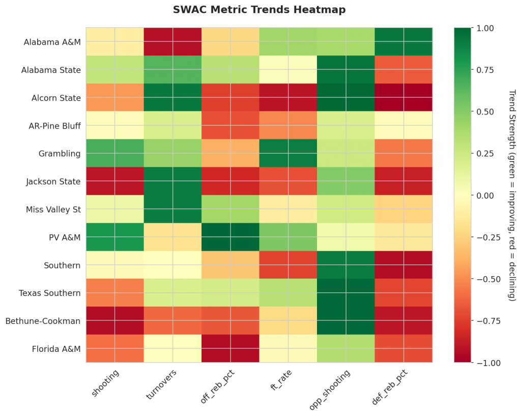 - Trending Down (Efficiency): Alabama A&M, Alcorn State, AR-Pine Bluff, Jackson State, Southern