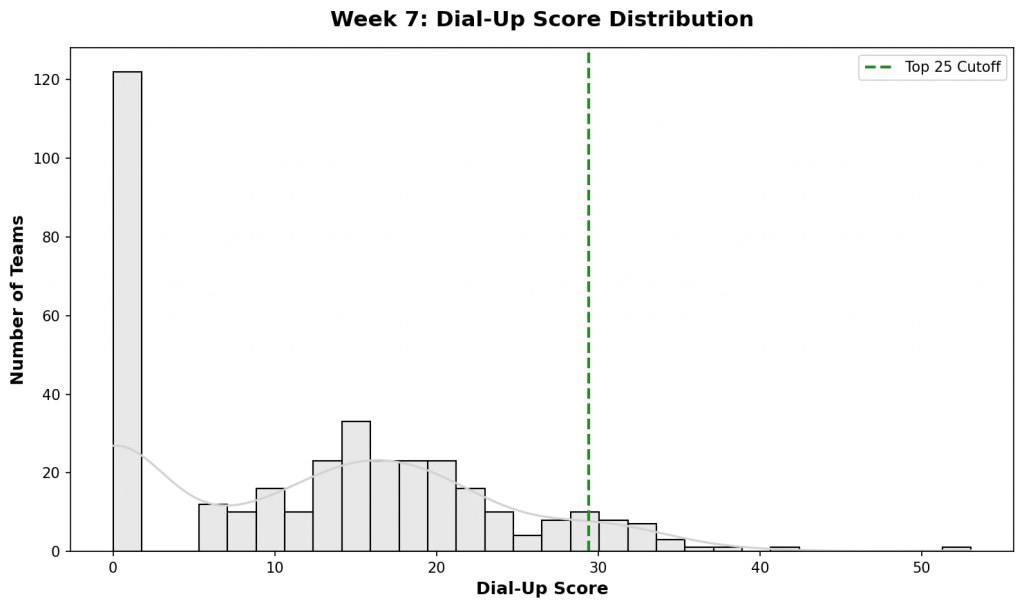 Figure 4: Distribution of Dial-Up scores across all Division I teams. The top 25 teams (highlighted in green) represent those with the most extreme performance splits based on opponent quality.