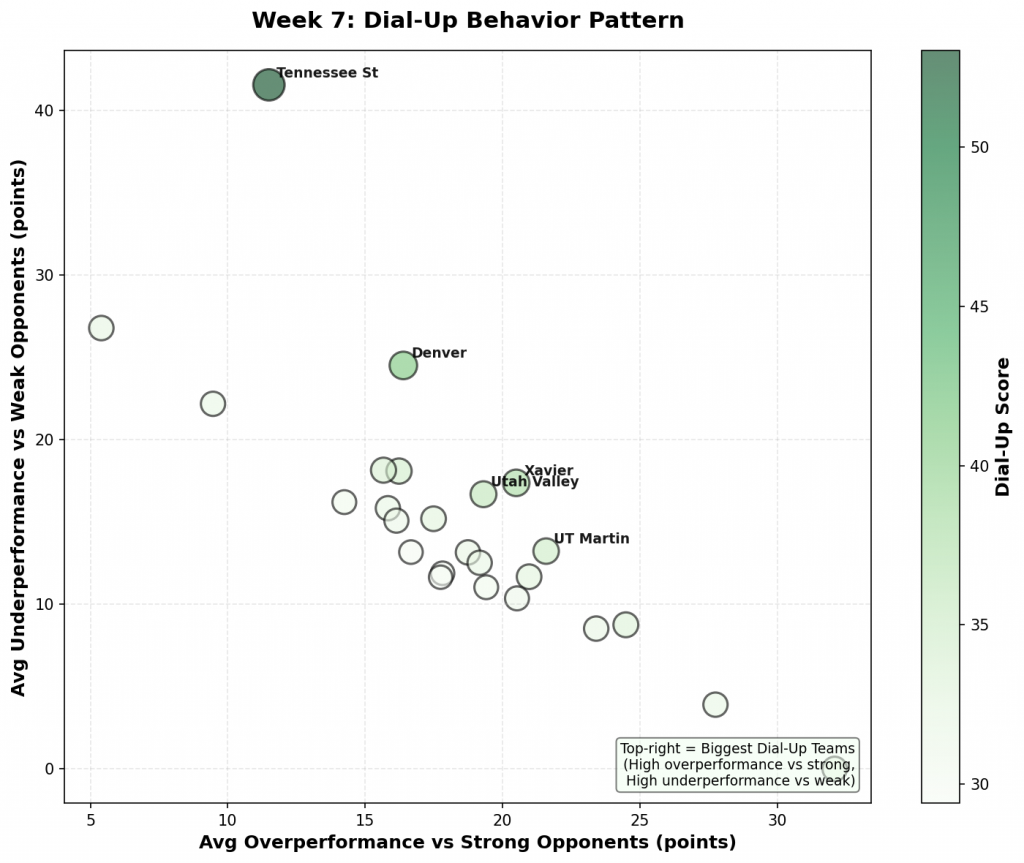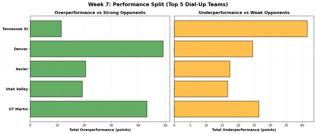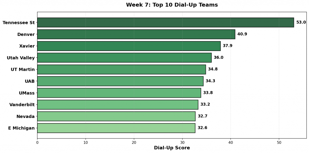 Figure 1: Top 10 teams with the highest Dial-Up scores in Week 7. Scores reflect the combination of overperformance against strong opponents and underperformance against weak ones.