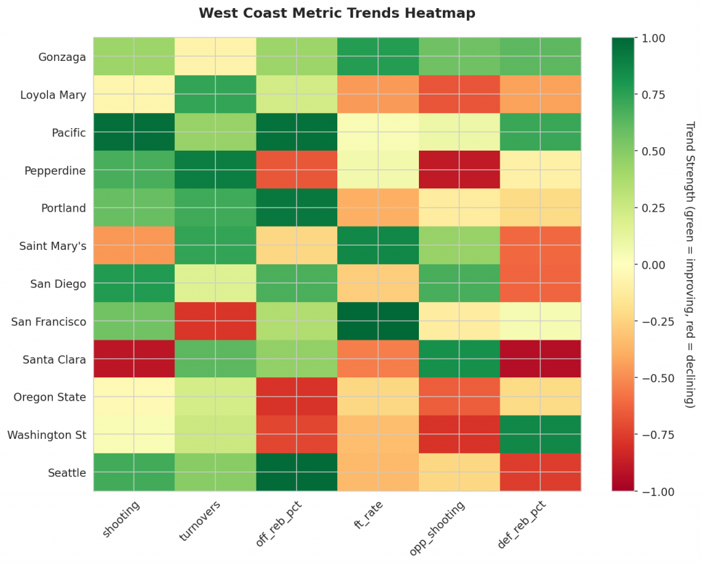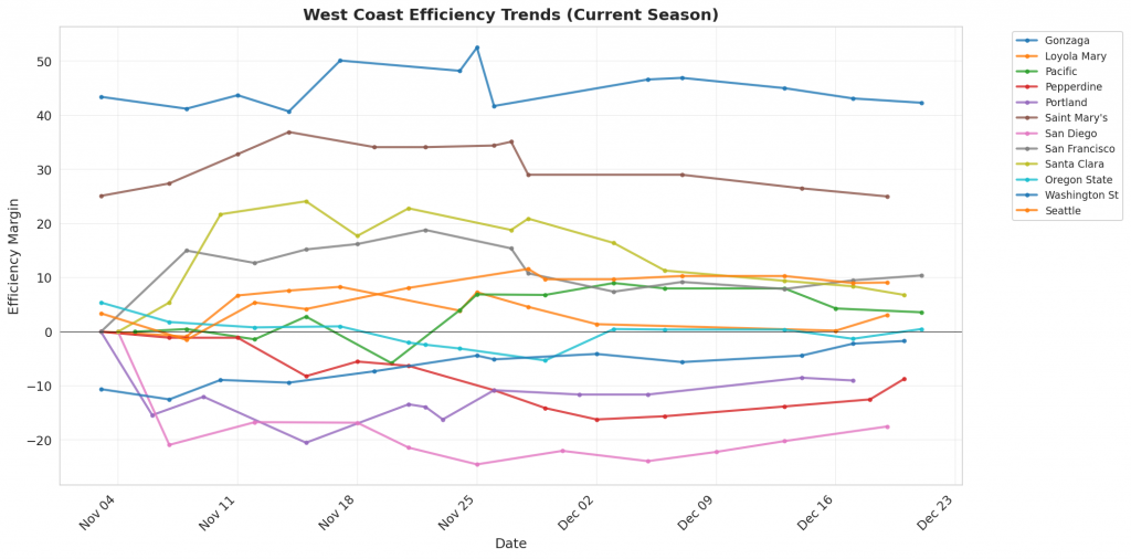 Figure 1: Efficiency margin trends for West Coast teams throughout the season. Teams trending upward show improving performance, while downward trends indicate struggles.