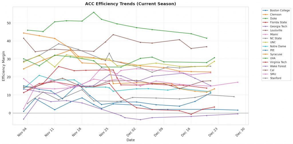 Figure 1: Efficiency margin trends for ACC teams throughout the season. Teams trending upward show improving performance, while downward trends indicate struggles.