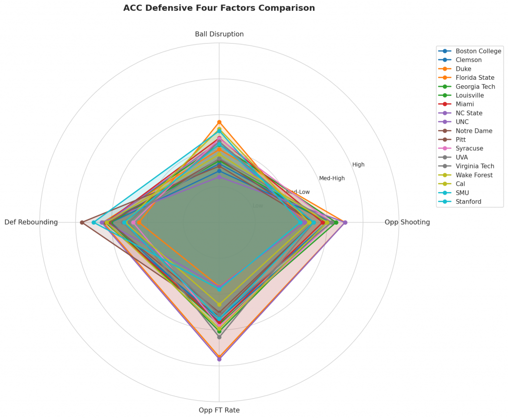 Figure 3: Defensive Four Factors comparison across ACC teams. The radar chart shows each team’s opponent shooting defense (Opp eFG%), ball disruption (forcing TOV%), defensive rebounding (DREB%), and opponent free throw prevention (Opp FT Rate).