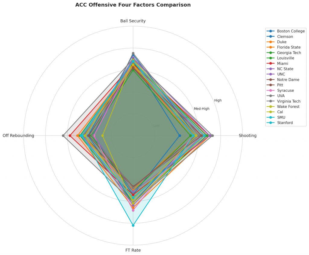 Figure 2: Offensive Four Factors comparison across ACC teams. The radar chart shows each team’s shooting efficiency (eFG%), ball security (TOV%), offensive rebounding (OREB%), and free throw generation (FT Rate).