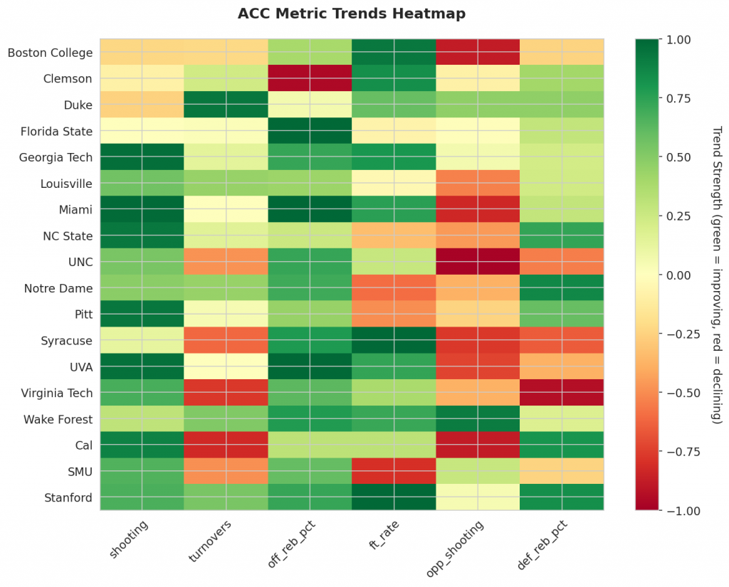 - Trending Down (Efficiency): Boston College, Clemson, Duke, Florida State