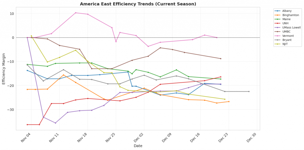 Figure 1: Efficiency margin trends for America East teams throughout the season. Teams trending upward show improving performance, while downward trends indicate struggles.