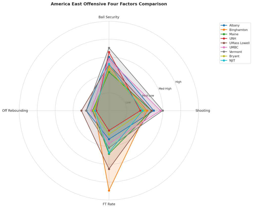Figure 2: Offensive Four Factors comparison across America East teams. The radar chart shows each team’s shooting efficiency (eFG%), ball security (TOV%), offensive rebounding (OREB%), and free throw generation (FT Rate).