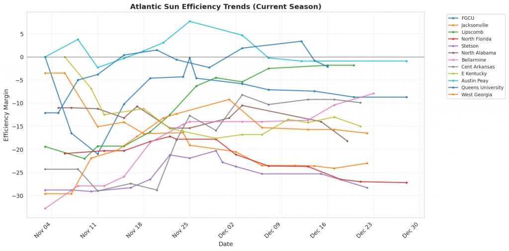 Figure 1: Efficiency margin trends for Atlantic Sun teams throughout the season. Teams trending upward show improving performance, while downward trends indicate struggles.