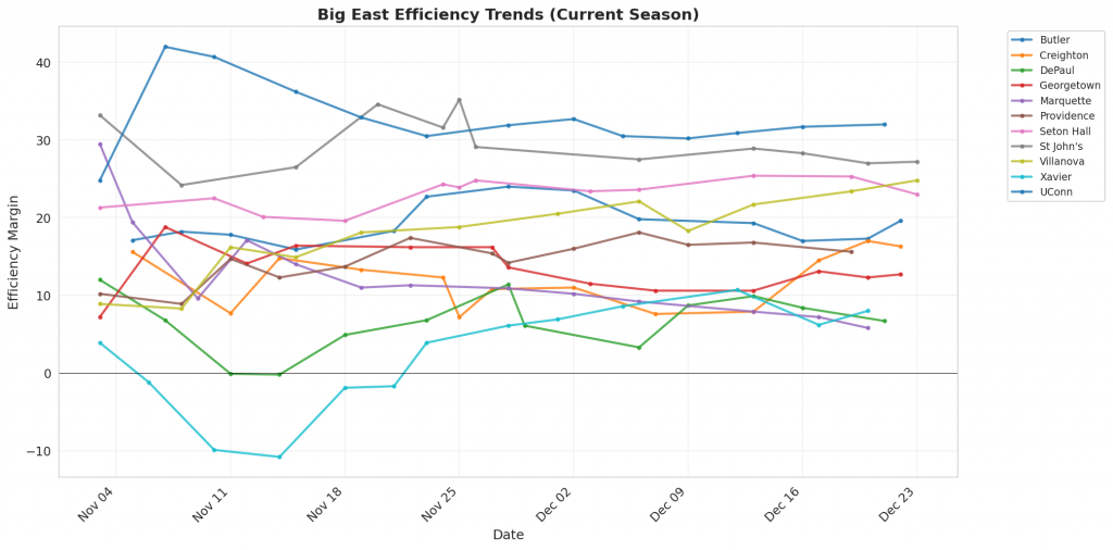 Figure 1: Efficiency margin trends for Big East teams throughout the season. Teams trending upward show improving performance, while downward trends indicate struggles.