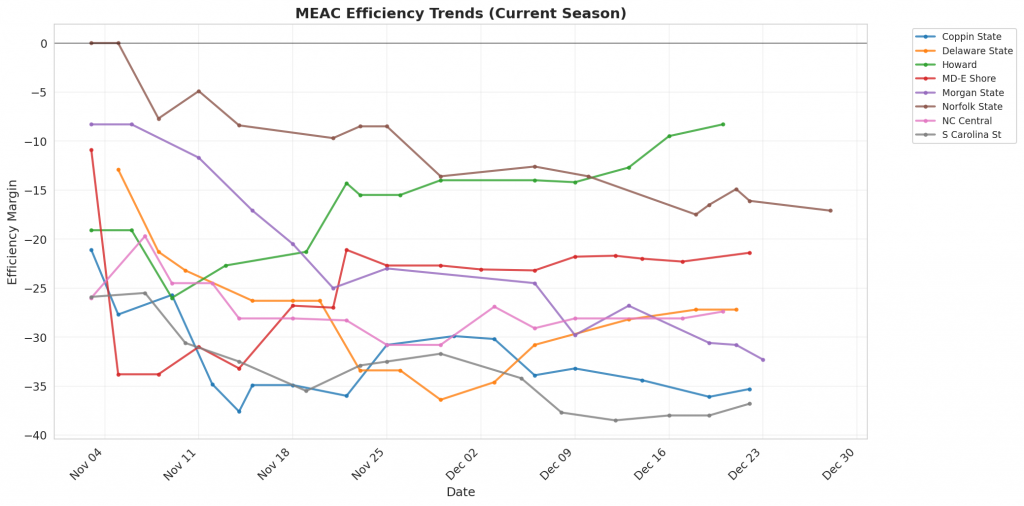 Figure 1: Efficiency margin trends for MEAC teams throughout the season. Teams trending upward show improving performance, while downward trends indicate struggles.