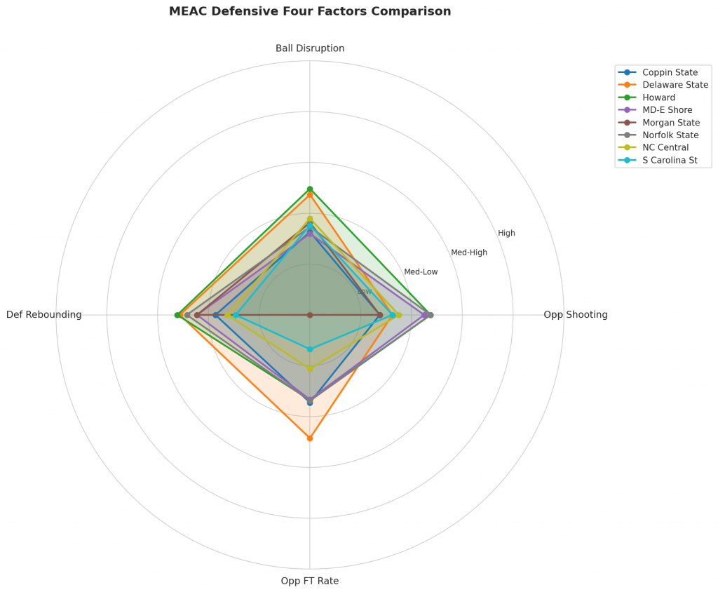 Figure 3: Defensive Four Factors comparison across MEAC teams. The radar chart shows each team’s opponent shooting defense (Opp eFG%), ball disruption (forcing TOV%), defensive rebounding (DREB%), and opponent free throw prevention (Opp FT Rate).