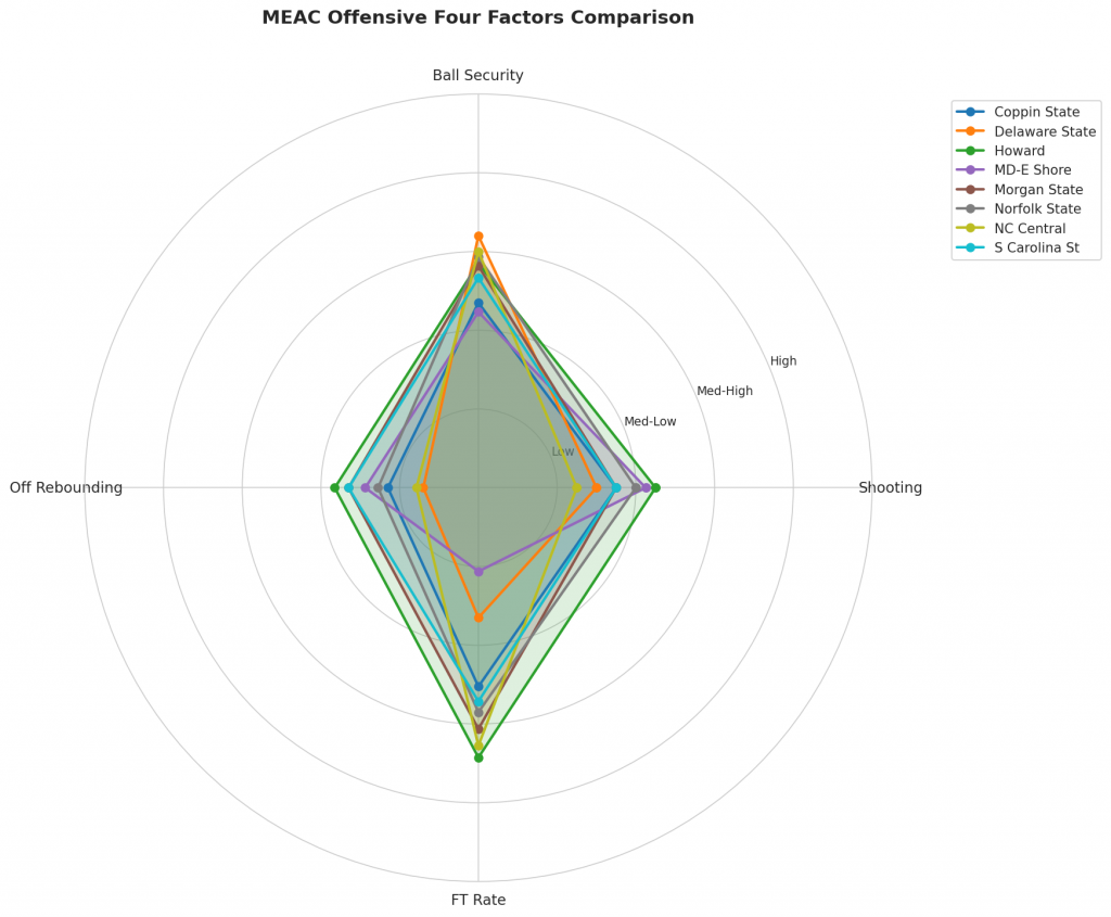 Figure 2: Offensive Four Factors comparison across MEAC teams. The radar chart shows each team’s shooting efficiency (eFG%), ball security (TOV%), offensive rebounding (OREB%), and free throw generation (FT Rate).