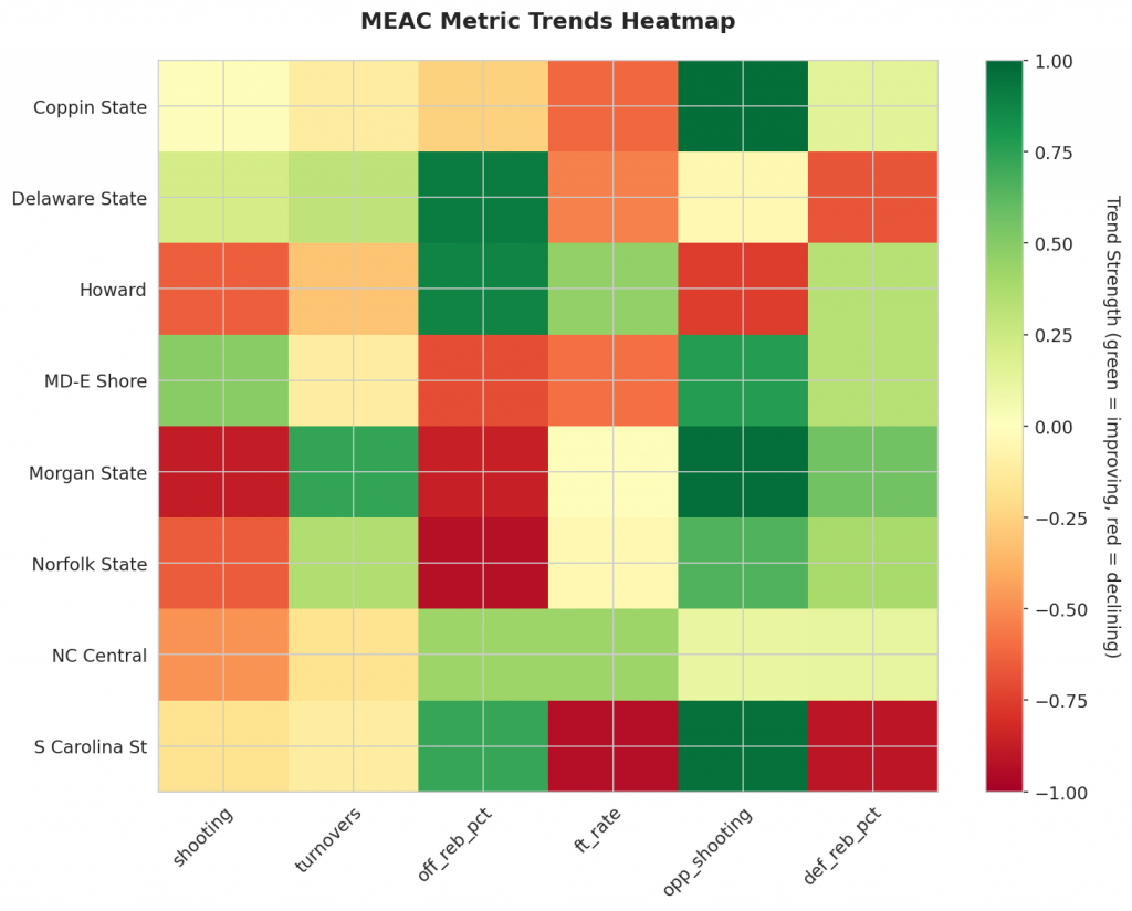 - Trending Down (Efficiency): Coppin State, Howard, Morgan State, Norfolk State, NC Central
