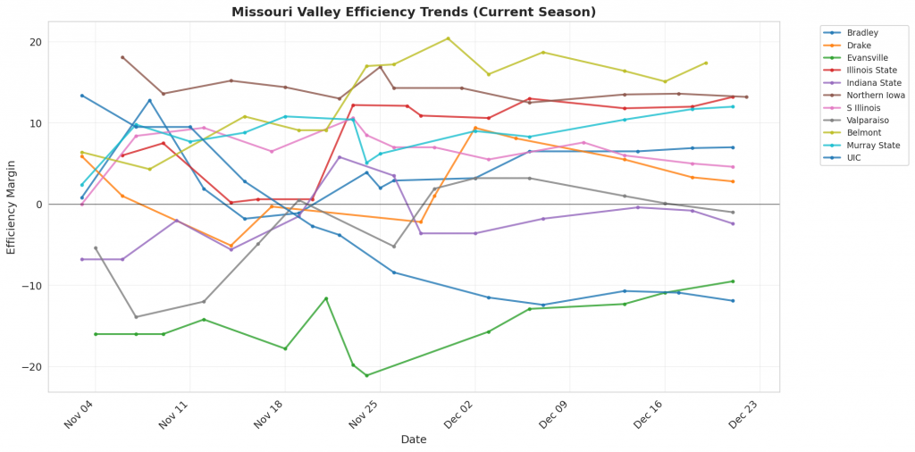 Figure 1: Efficiency margin trends for Missouri Valley teams throughout the season. Teams trending upward show improving performance, while downward trends indicate struggles.
