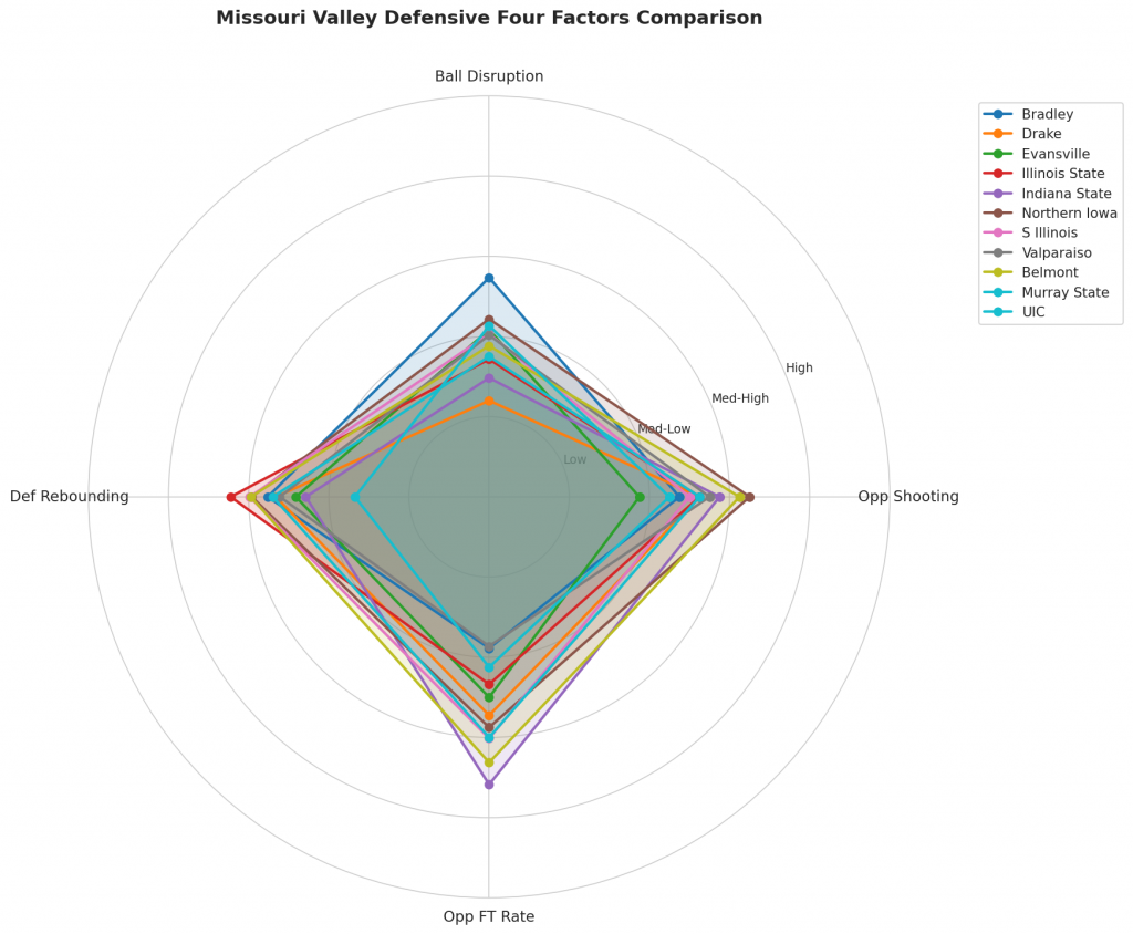 Figure 3: Defensive Four Factors comparison across Missouri Valley teams. The radar chart shows each team’s opponent shooting defense (Opp eFG%), ball disruption (forcing TOV%), defensive rebounding (DREB%), and opponent free throw prevention (Opp FT Rate).