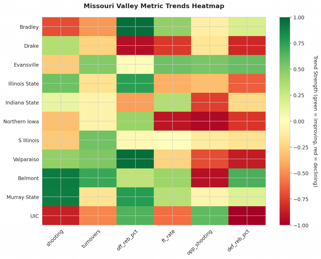 - Trending Up (Efficiency): Drake, Illinois State, Indiana State, Valparaiso, Belmont