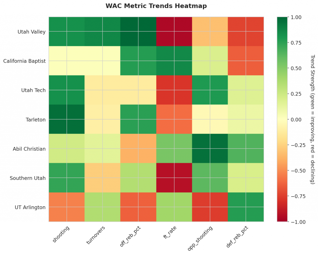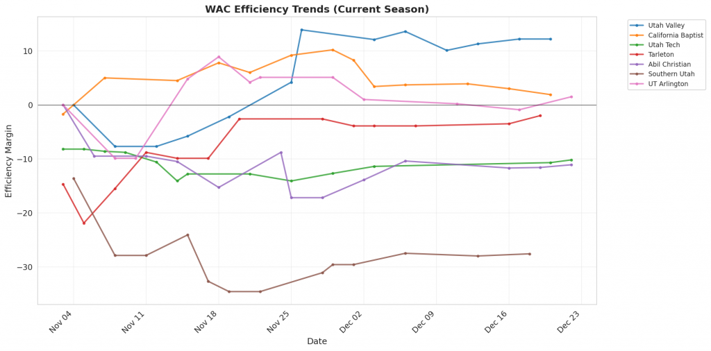 Figure 1: Efficiency margin trends for WAC teams throughout the season. Teams trending upward show improving performance, while downward trends indicate struggles.