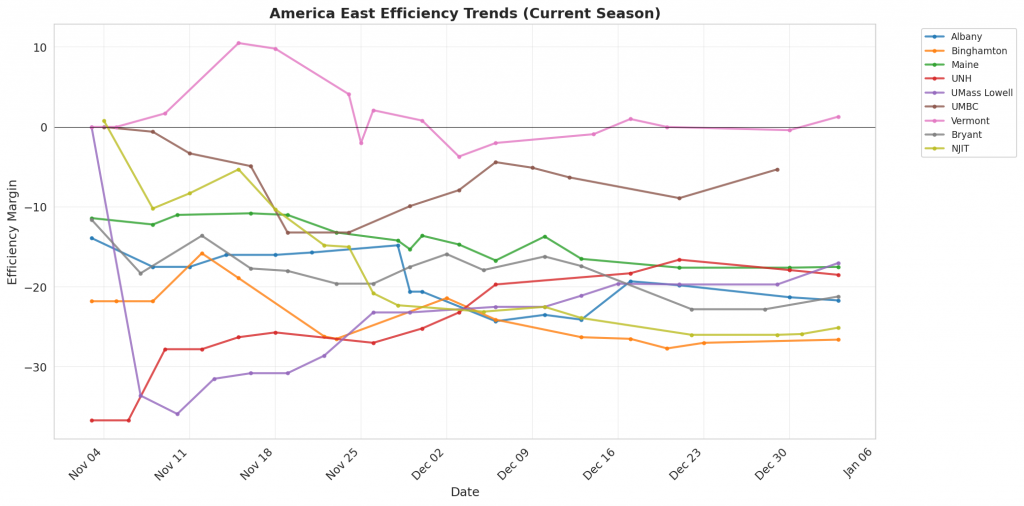 Figure 1: Efficiency margin trends for America East teams throughout the season. Teams trending upward show improving performance, while downward trends indicate struggles.