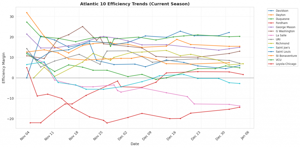 Figure 1: Efficiency margin trends for Atlantic 10 teams throughout the season. Teams trending upward show improving performance, while downward trends indicate struggles.