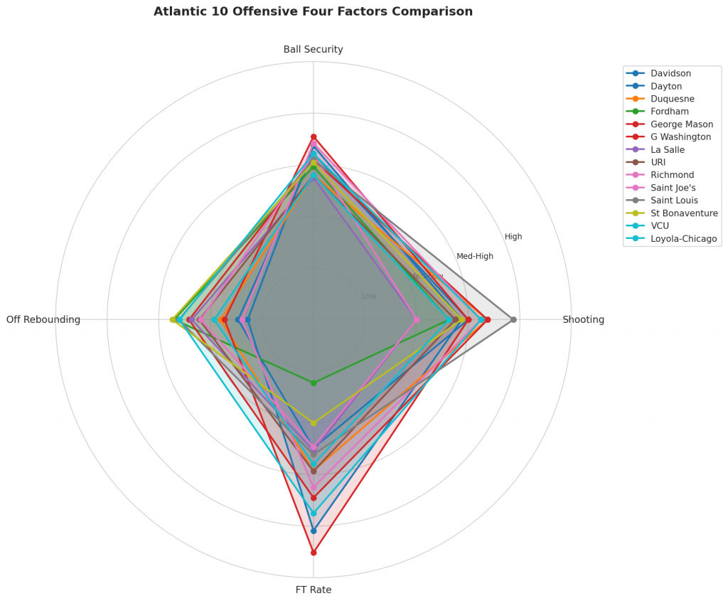Figure 2: Offensive Four Factors comparison across Atlantic 10 teams. The radar chart shows each team’s shooting efficiency (eFG%), ball security (TOV%), offensive rebounding (OREB%), and free throw generation (FT Rate).