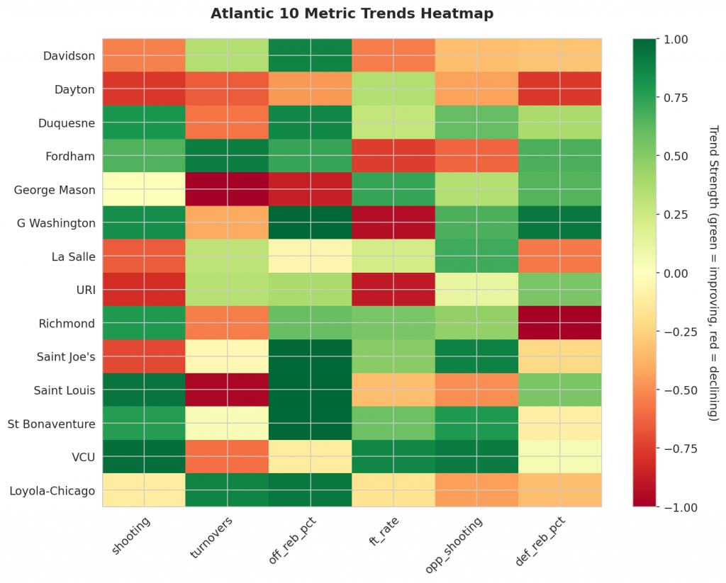 - Trending Down (Efficiency): Davidson, Dayton, La Salle, URI, Saint Joe’s