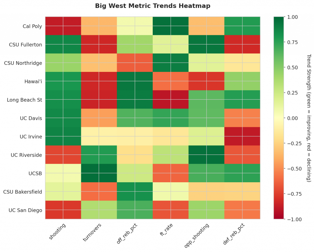 As Big West teams continue their season, the MACD trending indicators will help identify which teams are genuinely improving versus those riding unsustainable momentum. Check back next week for updated analysis.