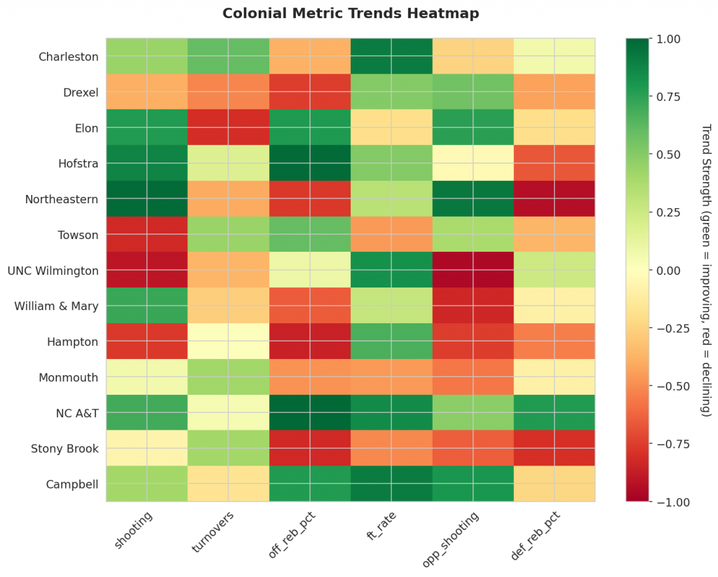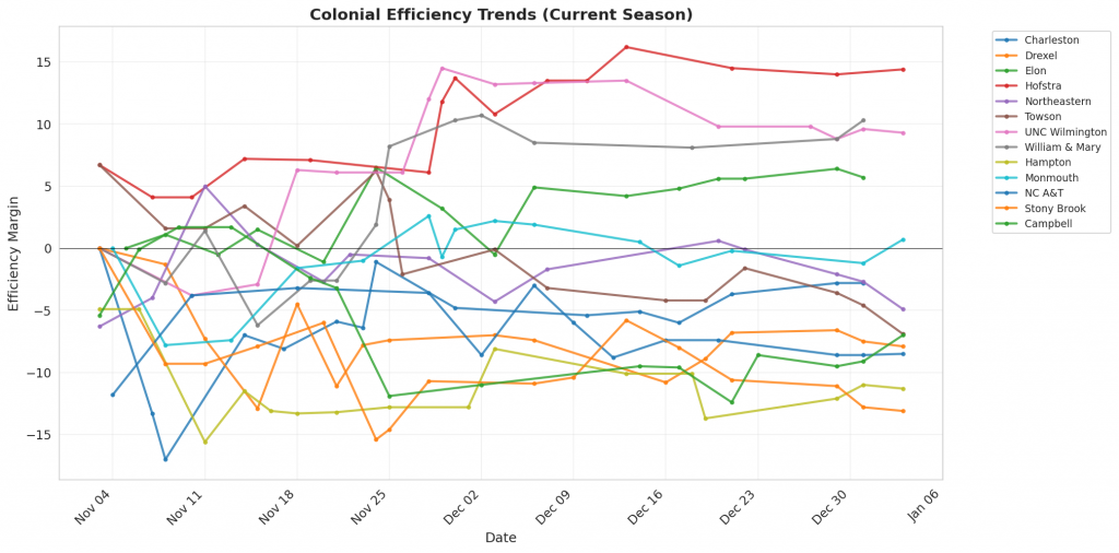 Figure 1: Efficiency margin trends for Colonial teams throughout the season. Teams trending upward show improving performance, while downward trends indicate struggles.