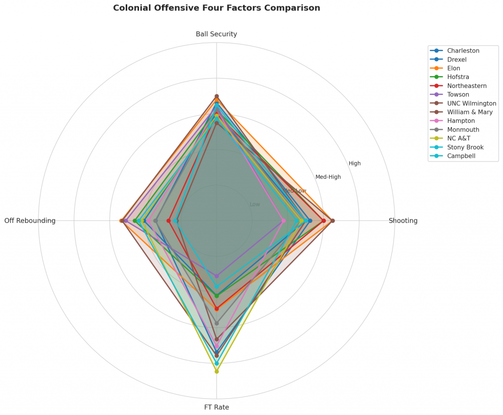 Figure 2: Offensive Four Factors comparison across Colonial teams. The radar chart shows each team’s shooting efficiency (eFG%), ball security (TOV%), offensive rebounding (OREB%), and free throw generation (FT Rate).
