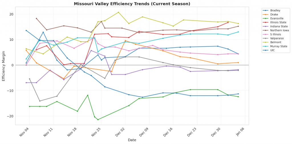 Figure 1: Efficiency margin trends for Missouri Valley teams throughout the season. Teams trending upward show improving performance, while downward trends indicate struggles.