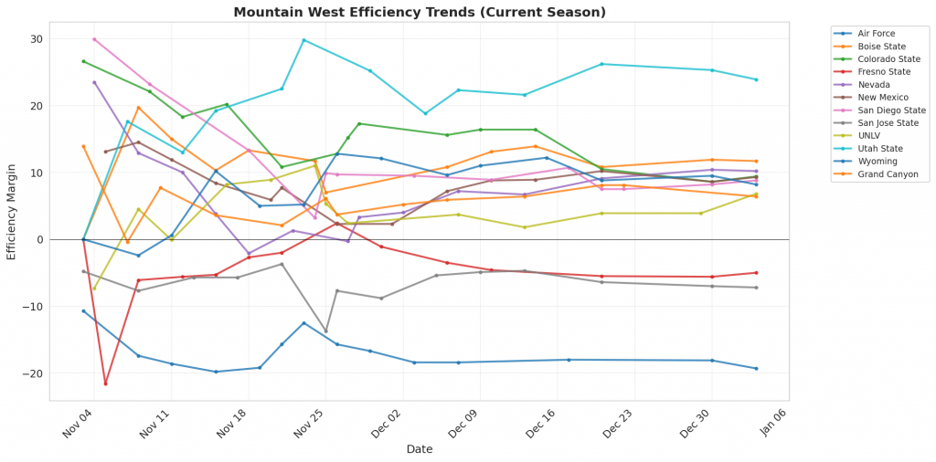 Figure 1: Efficiency margin trends for Mountain West teams throughout the season. Teams trending upward show improving performance, while downward trends indicate struggles.