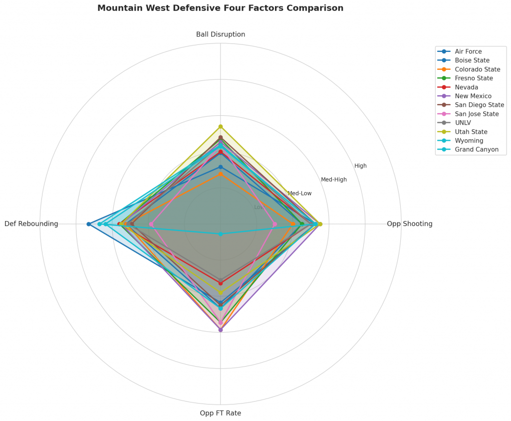 Figure 3: Defensive Four Factors comparison across Mountain West teams. The radar chart shows each team’s opponent shooting defense (Opp eFG%), ball disruption (forcing TOV%), defensive rebounding (DREB%), and opponent free throw prevention (Opp FT Rate).