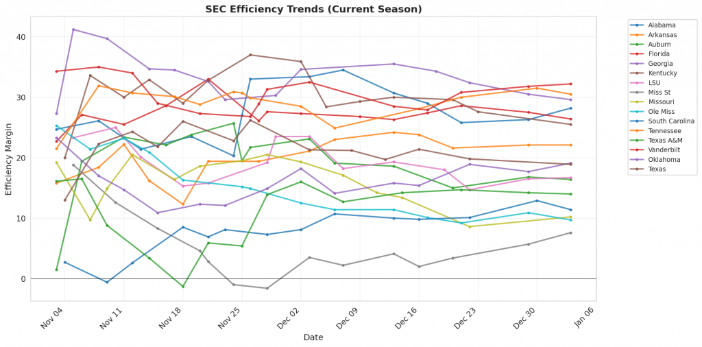 Figure 1: Efficiency margin trends for SEC teams throughout the season. Teams trending upward show improving performance, while downward trends indicate struggles.