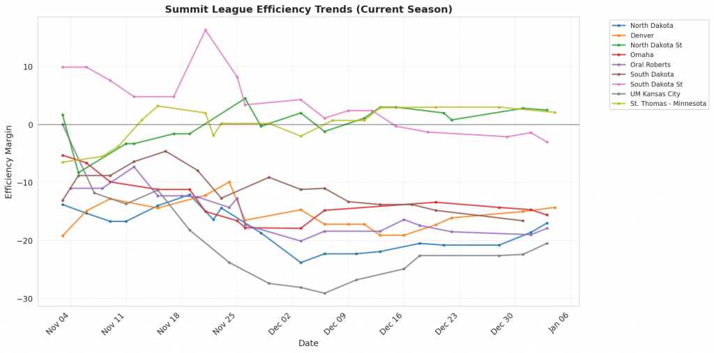 Figure 1: Efficiency margin trends for Summit League teams throughout the season. Teams trending upward show improving performance, while downward trends indicate struggles.