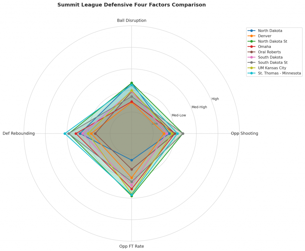 Figure 3: Defensive Four Factors comparison across Summit League teams. The radar chart shows each team’s opponent shooting defense (Opp eFG%), ball disruption (forcing TOV%), defensive rebounding (DREB%), and opponent free throw prevention (Opp FT Rate).