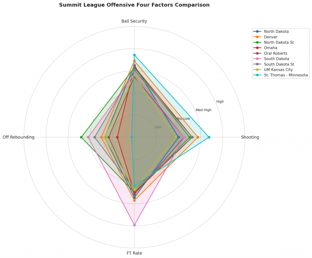 Figure 2: Offensive Four Factors comparison across Summit League teams. The radar chart shows each team’s shooting efficiency (eFG%), ball security (TOV%), offensive rebounding (OREB%), and free throw generation (FT Rate).