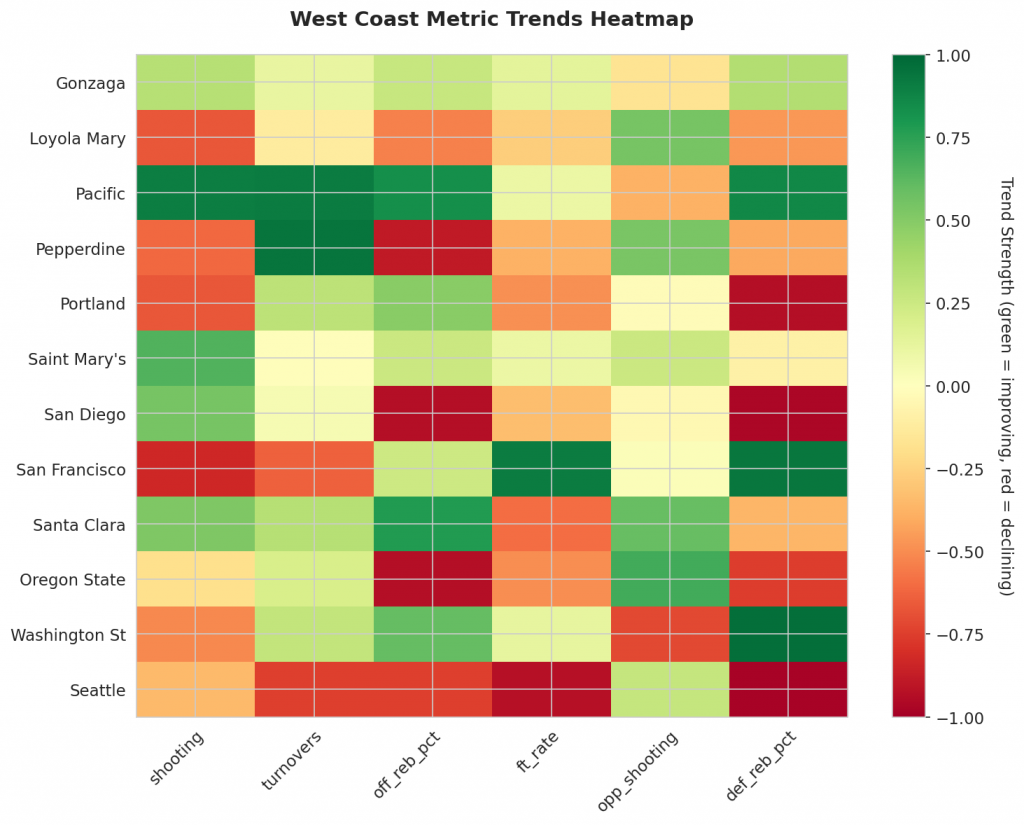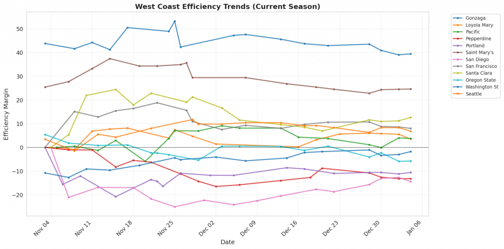 Figure 1: Efficiency margin trends for West Coast teams throughout the season. Teams trending upward show improving performance, while downward trends indicate struggles.