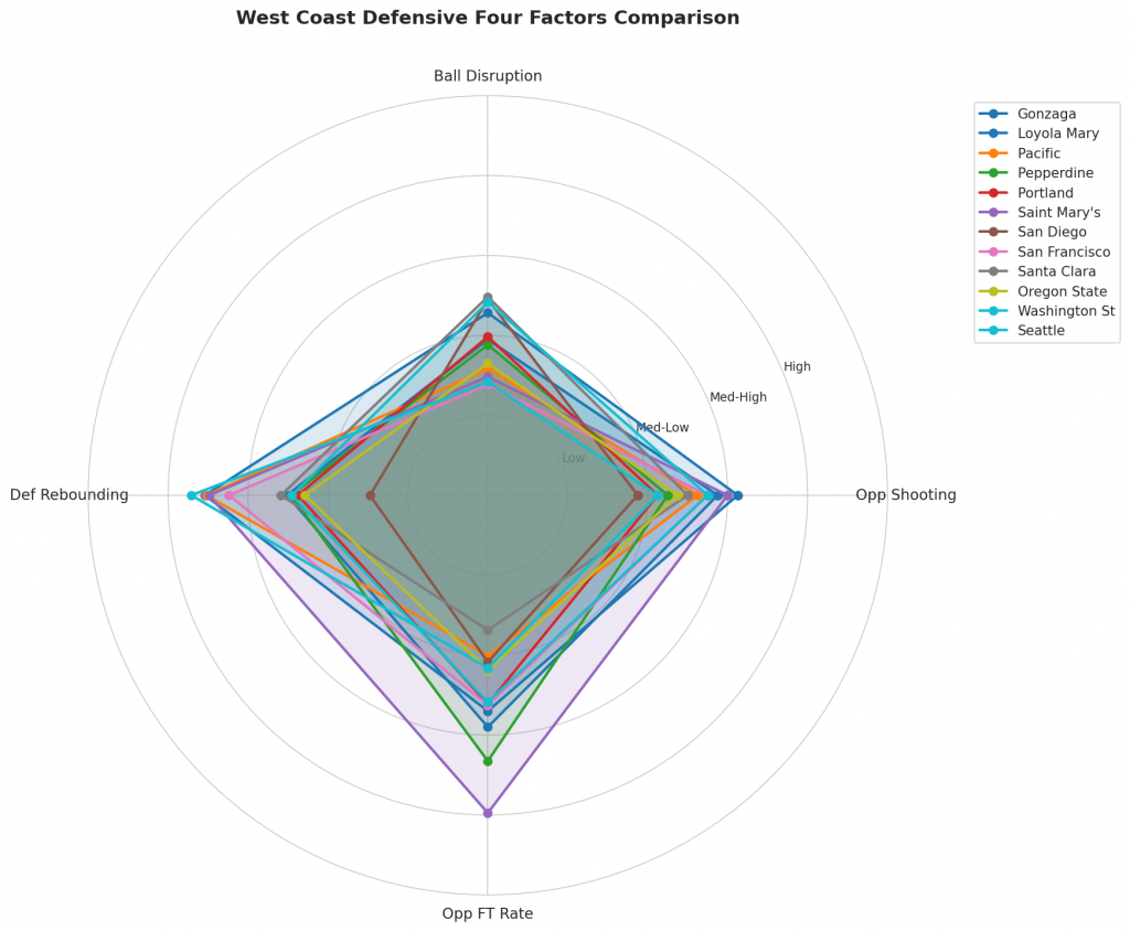 Figure 3: Defensive Four Factors comparison across West Coast teams. The radar chart shows each team’s opponent shooting defense (Opp eFG%), ball disruption (forcing TOV%), defensive rebounding (DREB%), and opponent free throw prevention (Opp FT Rate).