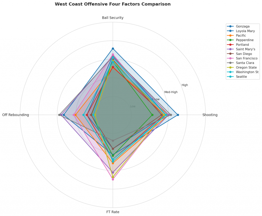 Figure 2: Offensive Four Factors comparison across West Coast teams. The radar chart shows each team’s shooting efficiency (eFG%), ball security (TOV%), offensive rebounding (OREB%), and free throw generation (FT Rate).