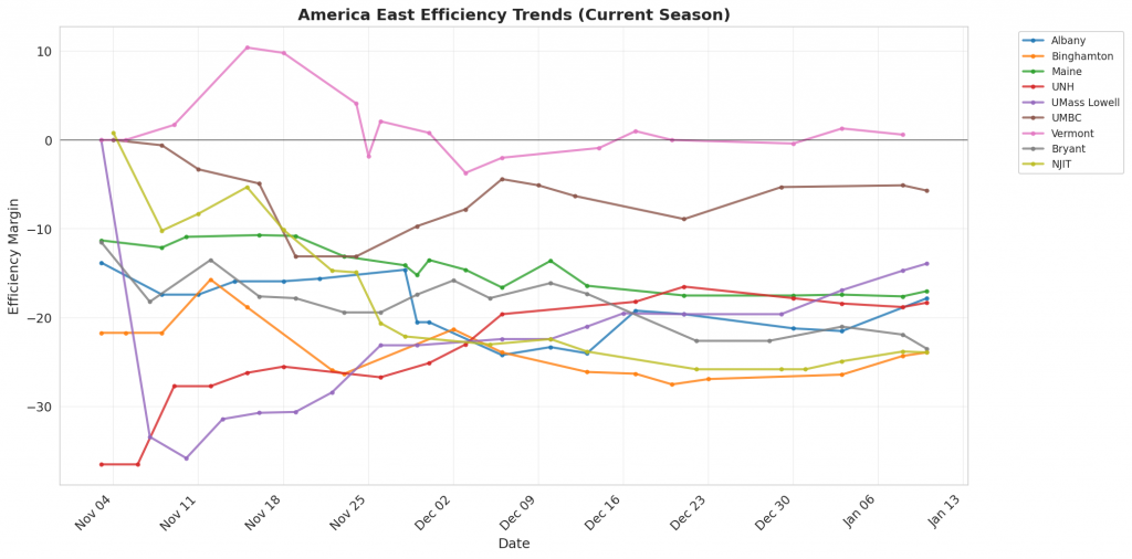 Figure 1: Efficiency margin trends for America East teams throughout the season. Teams trending upward show improving performance, while downward trends indicate struggles.