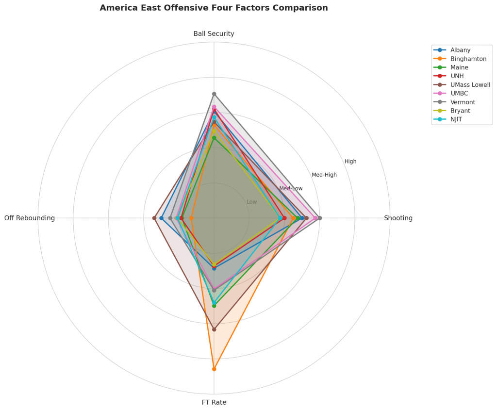 Figure 2: Offensive Four Factors comparison across America East teams. The radar chart shows each team’s shooting efficiency (eFG%), ball security (TOV%), offensive rebounding (OREB%), and free throw generation (FT Rate).