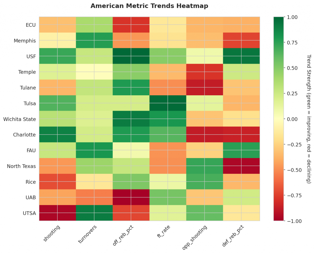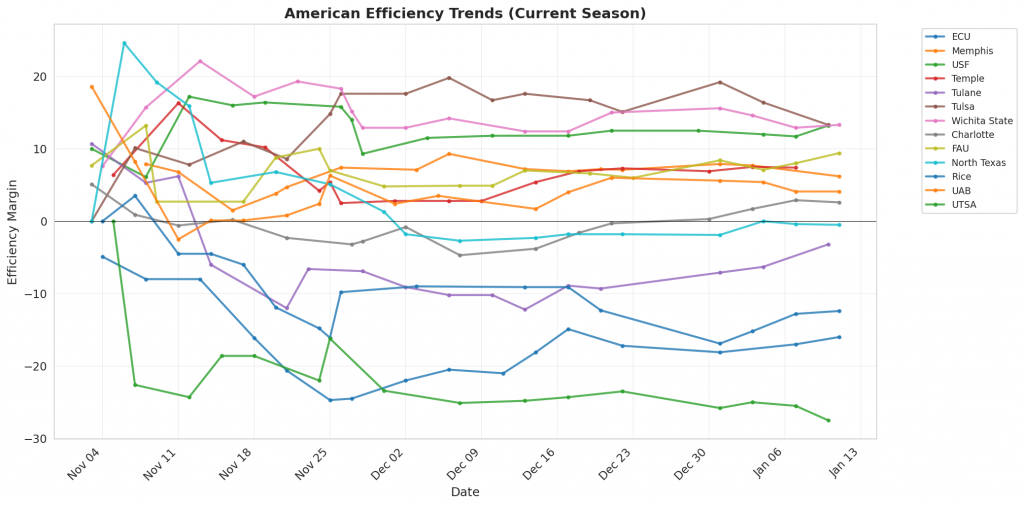 Figure 1: Efficiency margin trends for American teams throughout the season. Teams trending upward show improving performance, while downward trends indicate struggles.