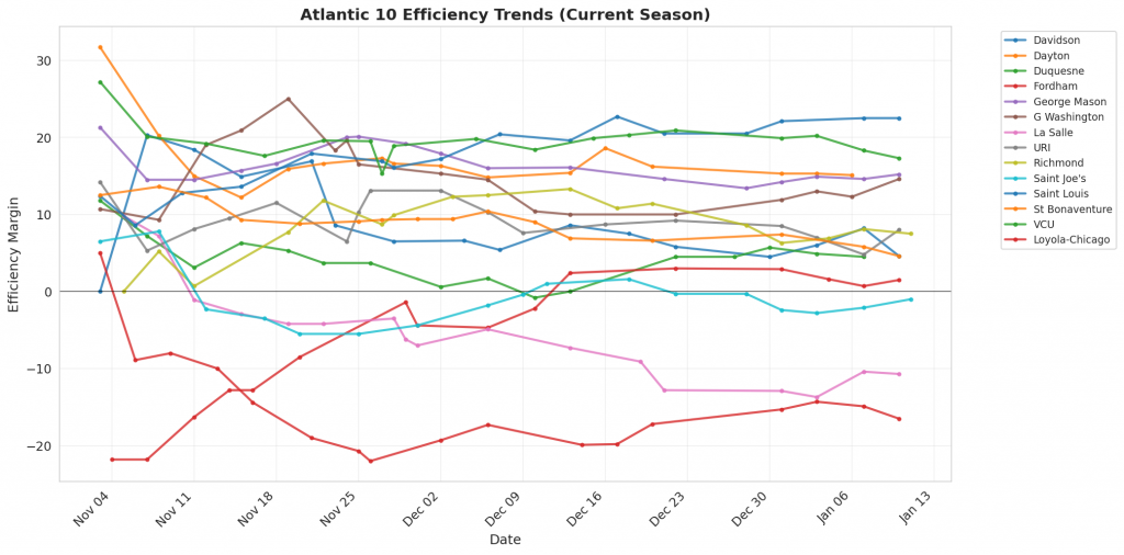 Figure 1: Efficiency margin trends for Atlantic 10 teams throughout the season. Teams trending upward show improving performance, while downward trends indicate struggles.