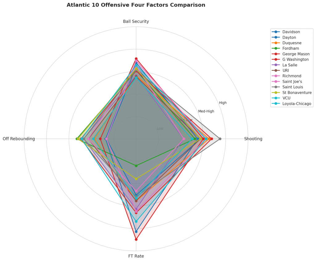 Figure 2: Offensive Four Factors comparison across Atlantic 10 teams. The radar chart shows each team’s shooting efficiency (eFG%), ball security (TOV%), offensive rebounding (OREB%), and free throw generation (FT Rate).