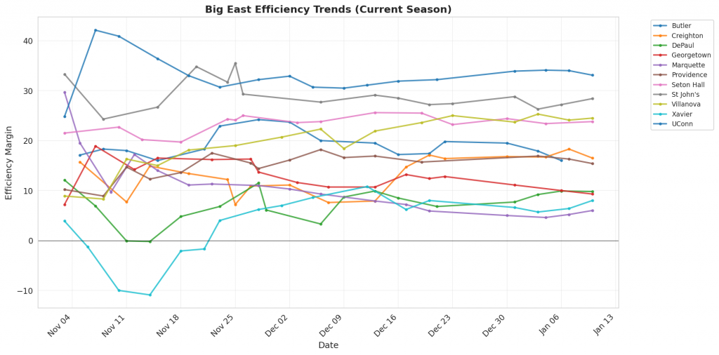 Figure 1: Efficiency margin trends for Big East teams throughout the season. Teams trending upward show improving performance, while downward trends indicate struggles.