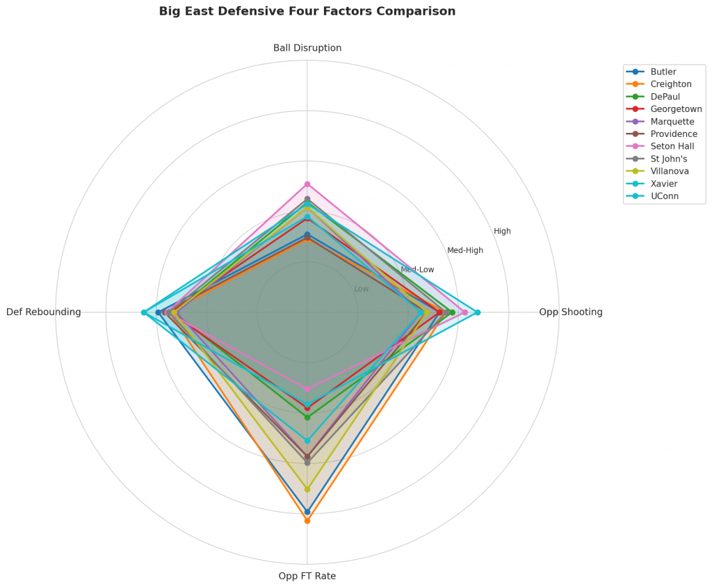 Figure 3: Defensive Four Factors comparison across Big East teams. The radar chart shows each team’s opponent shooting defense (Opp eFG%), ball disruption (forcing TOV%), defensive rebounding (DREB%), and opponent free throw prevention (Opp FT Rate).