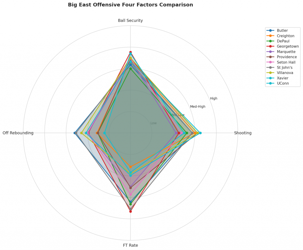 Figure 2: Offensive Four Factors comparison across Big East teams. The radar chart shows each team’s shooting efficiency (eFG%), ball security (TOV%), offensive rebounding (OREB%), and free throw generation (FT Rate).