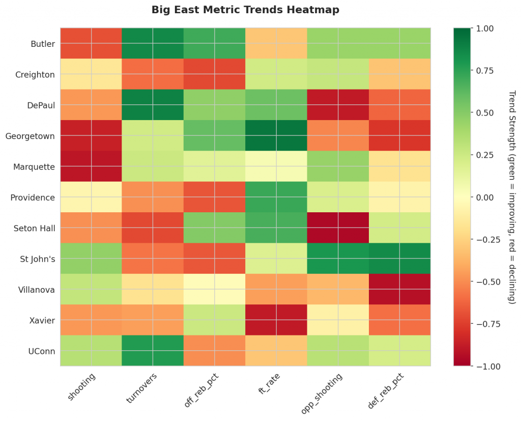 - Trending Down (Efficiency): Butler, Creighton, DePaul, Georgetown, Marquette