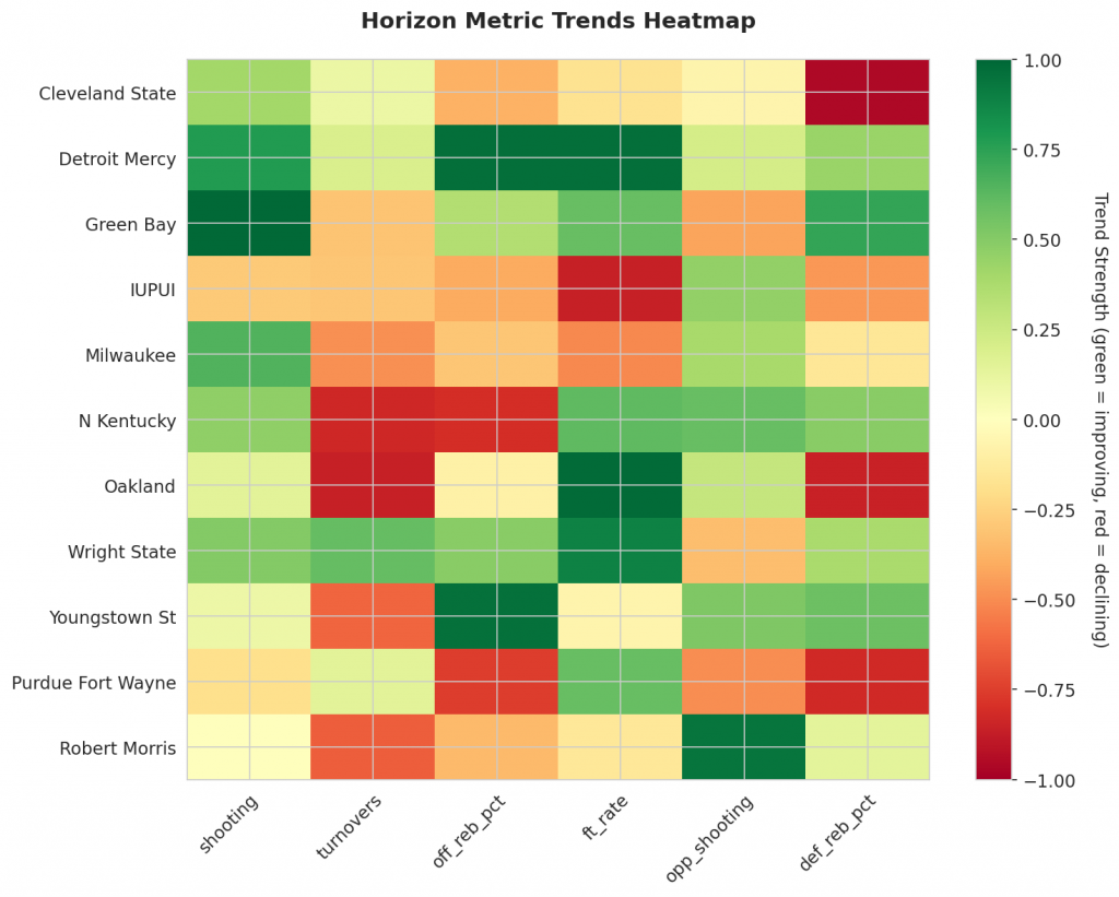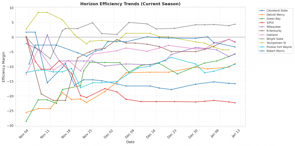 Figure 1: Efficiency margin trends for Horizon teams throughout the season. Teams trending upward show improving performance, while downward trends indicate struggles.